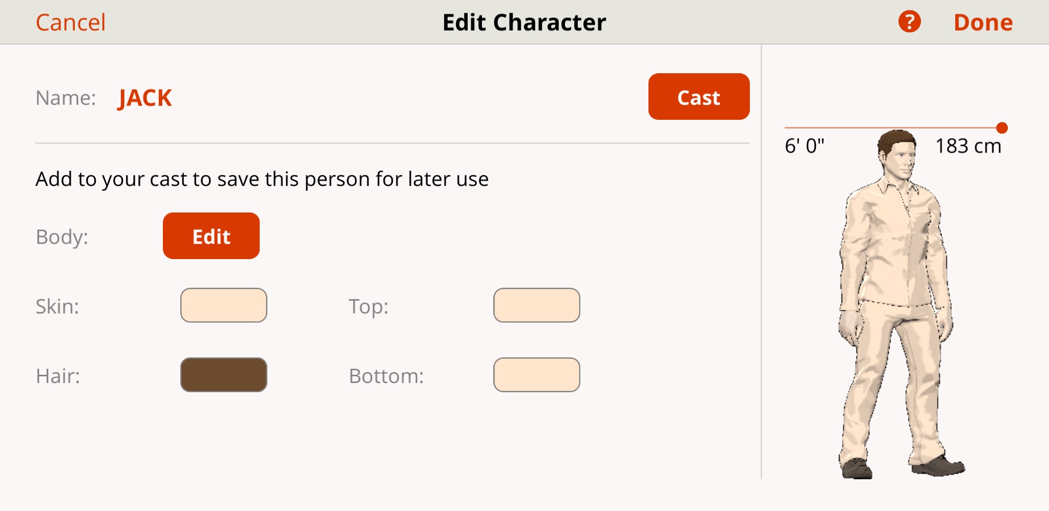 Note: there are more color options for 'Hair' and 'Skin' than 'Top' and 'Bottom'. Choose a skin tone closest to your character's from what's available in 'Top' and 'Bottom'. The 'Skin', 'Top', and 'Bottom' should all be the same color.